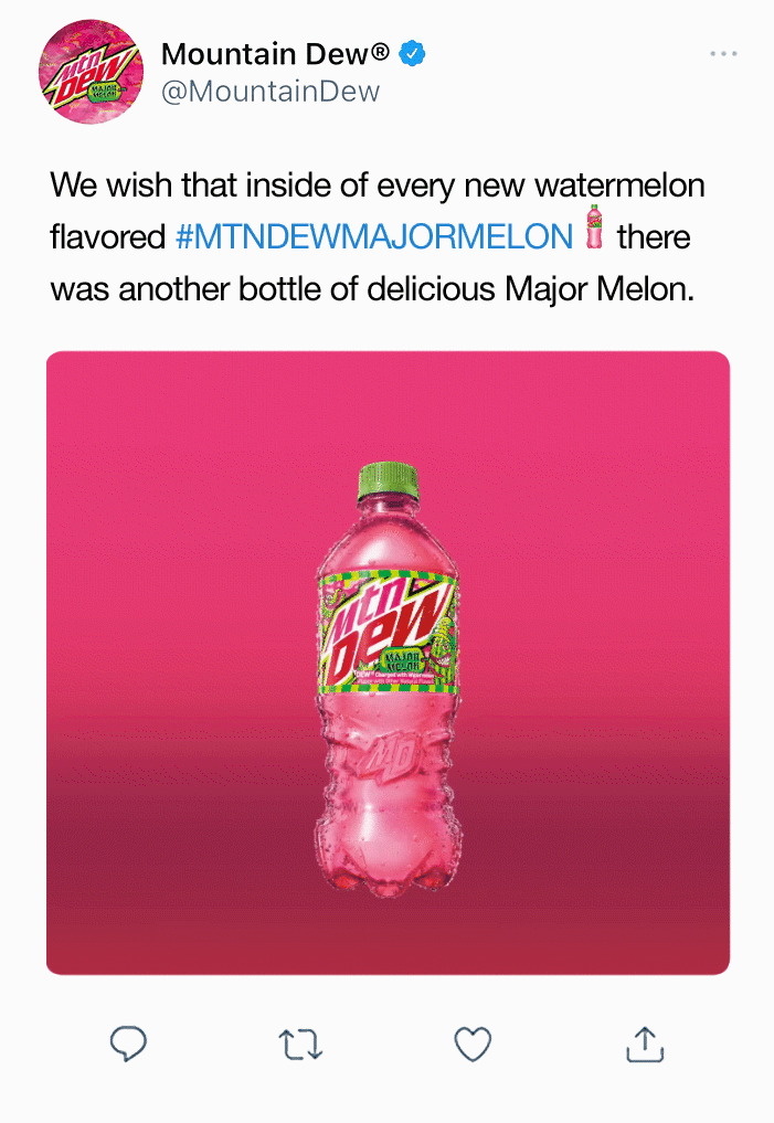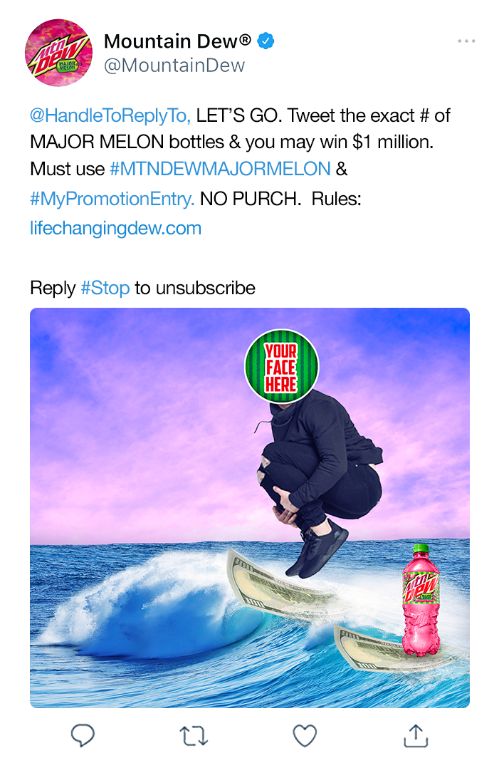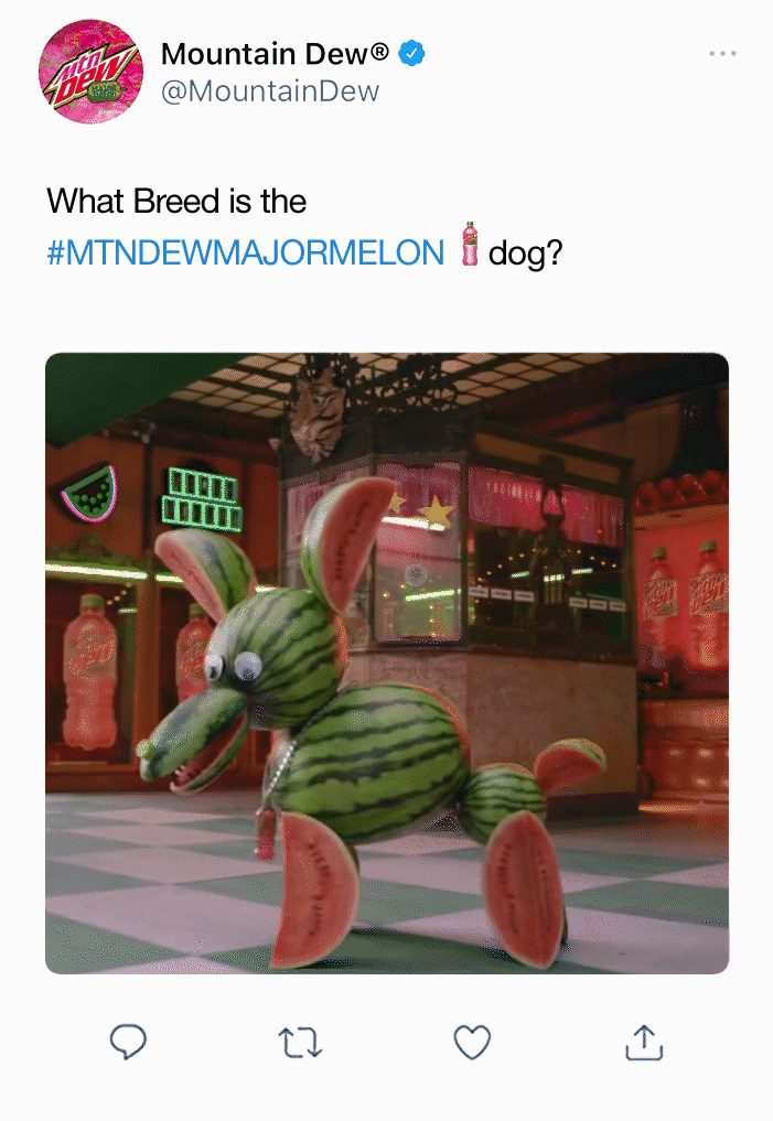 For the release of Mountain Dew's Major Melon flavor, we created a 360 social campaign for the Super Bowl. Whoever counted all 243 bottles of MTN Dew Major Melon in our commercial, and tweeted the correct amount first, won $1,000,000. The world tweeted and we reacted, winning the #1 digital share of voice at the Super Bowl.